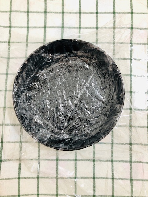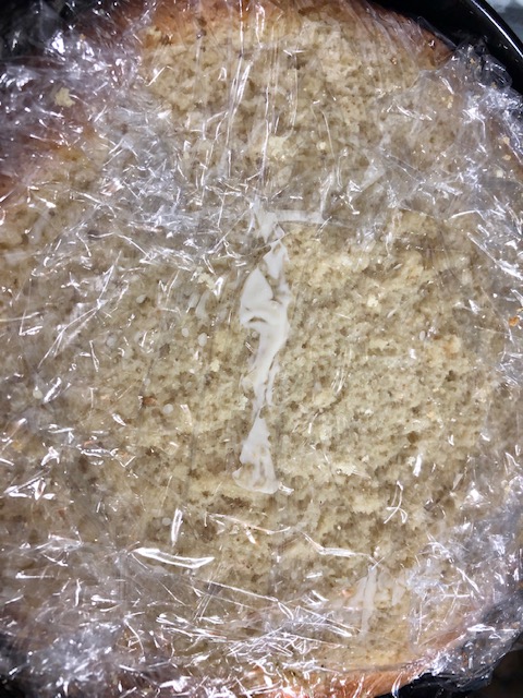 Coge el molde donde horneaste el pastel y cubrelo por completo con papel transparente (foto nº2) dejando lo largo por los lados para después poder taparlo por completo.