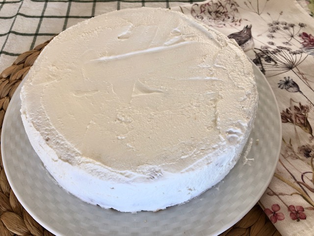 Cuando ya haya reposado el pastel demoldalo y retira el papel transparente con mucho cuidado. Déjala en el frigorífico mientras preparas rápidamente la nata montada.
