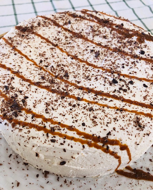 Cuando la nata este lista empieza a decorar el pastel con ayuda de una espátula hasta dejarla completamente cubierta como la (foto nº5). Con el dulce de leche haz unas rayas encima del pastel y por último ralla un poco de chocolate por encima del pastel y ya la tendrías lista como la última fotografía.